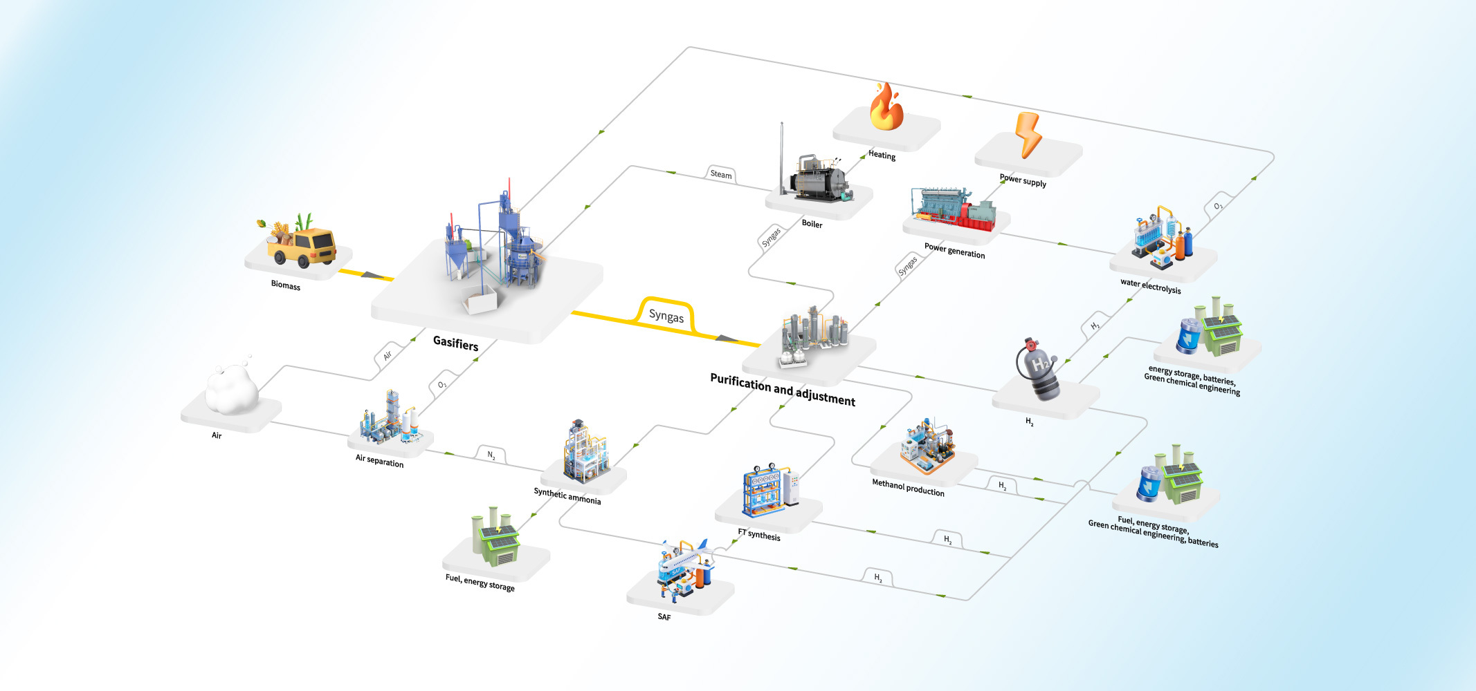 01.Environmental BenefitsGasification is a much cleaner process than combustion, it can create fewer air emissions and generate less waste than most traditional energy technologies.It helps reduce the environmental impact of waste disposal because it can use waste materials as feedstocks to generate valuable products from materials that would otherwise be disposed as wastes. Through waste recycling, it boosts sustainable development and contributes to world's environmental construction.