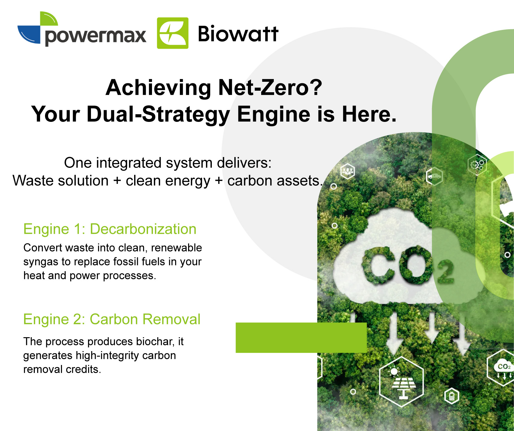 Our biomass gasification technology provides an integrated solution—a twin-engine system for both decarbonization and durable carbon removal.